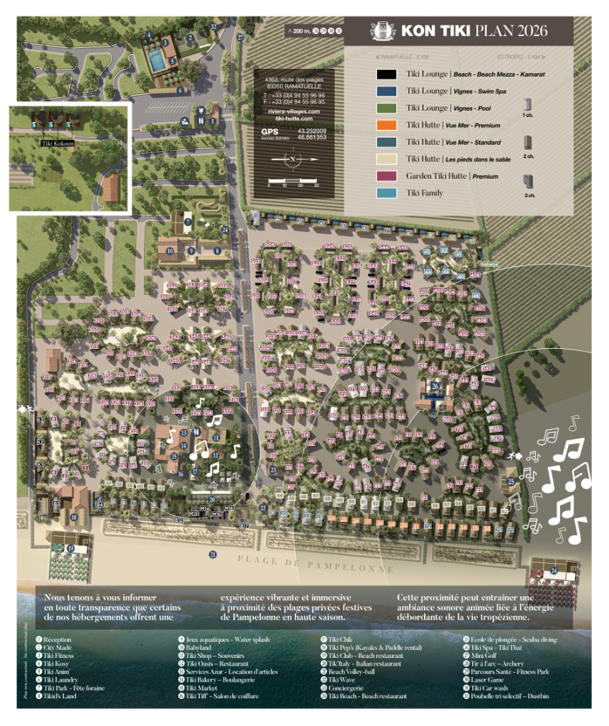Machen Sie sich für die typische Pampelonne-Partystimmung bereit! In den nahegelegenen Privatstränden und Clubs wird die Energie des Golfs von Saint-Tropez von Ende Juni bis Anfang September lebendig gefeiert. Bitte beachten Sie, dass einige unserer Unterkünfte gelegentlichem Lärm ausgesetzt sein können, der zum Saint Tropez-Beachlife dazugehört. Wir bemühen uns, die Auswirkungen so gering wie möglich zu halten und Ihren Komfort zu gewährleisten. Gleichzeitig laden wir Sie ein, die pulsierende Atmosphäre zu genießen, die unser Reiseziel zu einem lebendigen Juwel an der Côte d'Azur macht. Diejenigen, die mehr Ruhe suchen, ermuntern wir, die weniger exponierten Bereiche unseres Dorfes zu wählen. Wählen Sie dazu die Option "My Tiki Hutte" und suchen Sie Ihren ruhigen Platz aus oder weichen Sie gerne in die gelassenen Vor- bzw. Nachsaison-Zeiten aus.