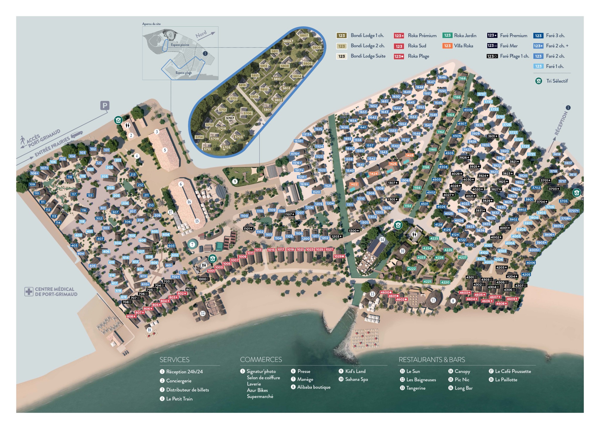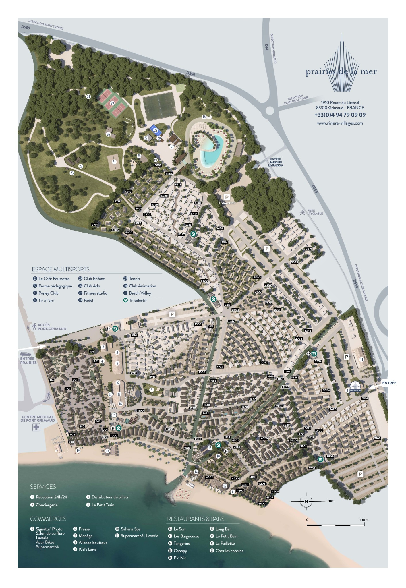 Visualisieren Sie auf einen Blick Prairies de la Mer und seine verschiedenen Dienstleistungen dank des Generalplans. Sie können ihn in hoher Auflösung herunterladen, indem Sie auf die untenstehende Schaltfläche klicken.